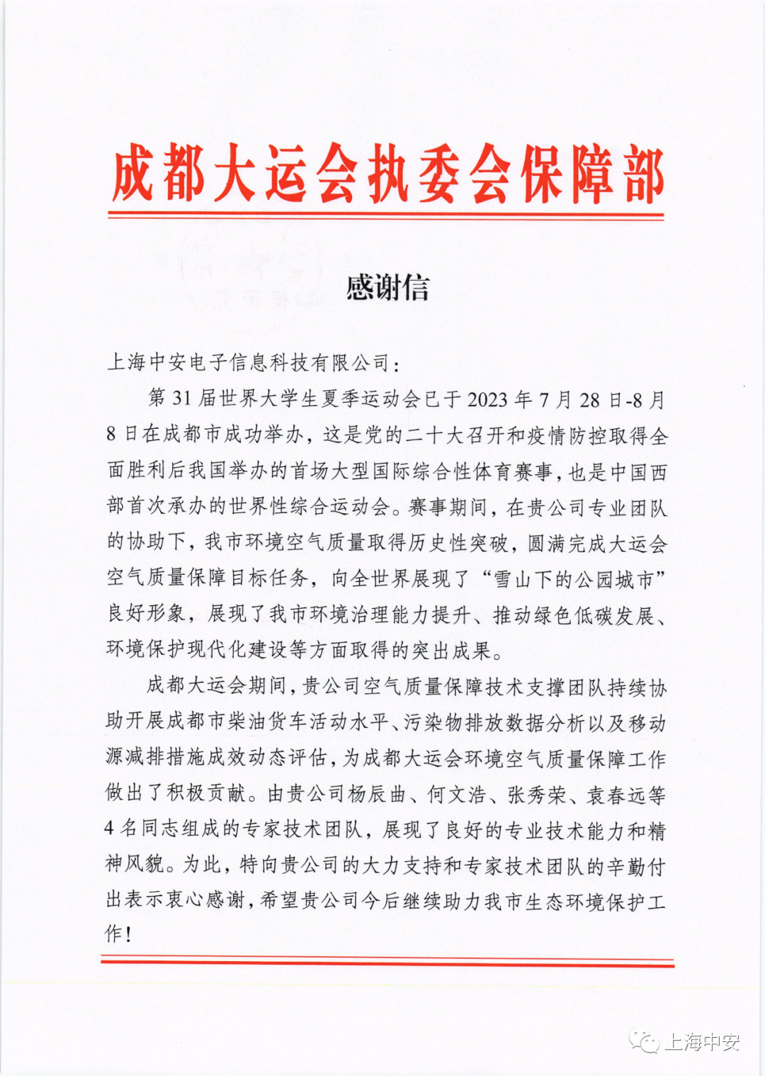 成都大運(yùn)會(huì)執(zhí)委會(huì)保障部發(fā)來(lái)一封感謝信!(2023-10-15)